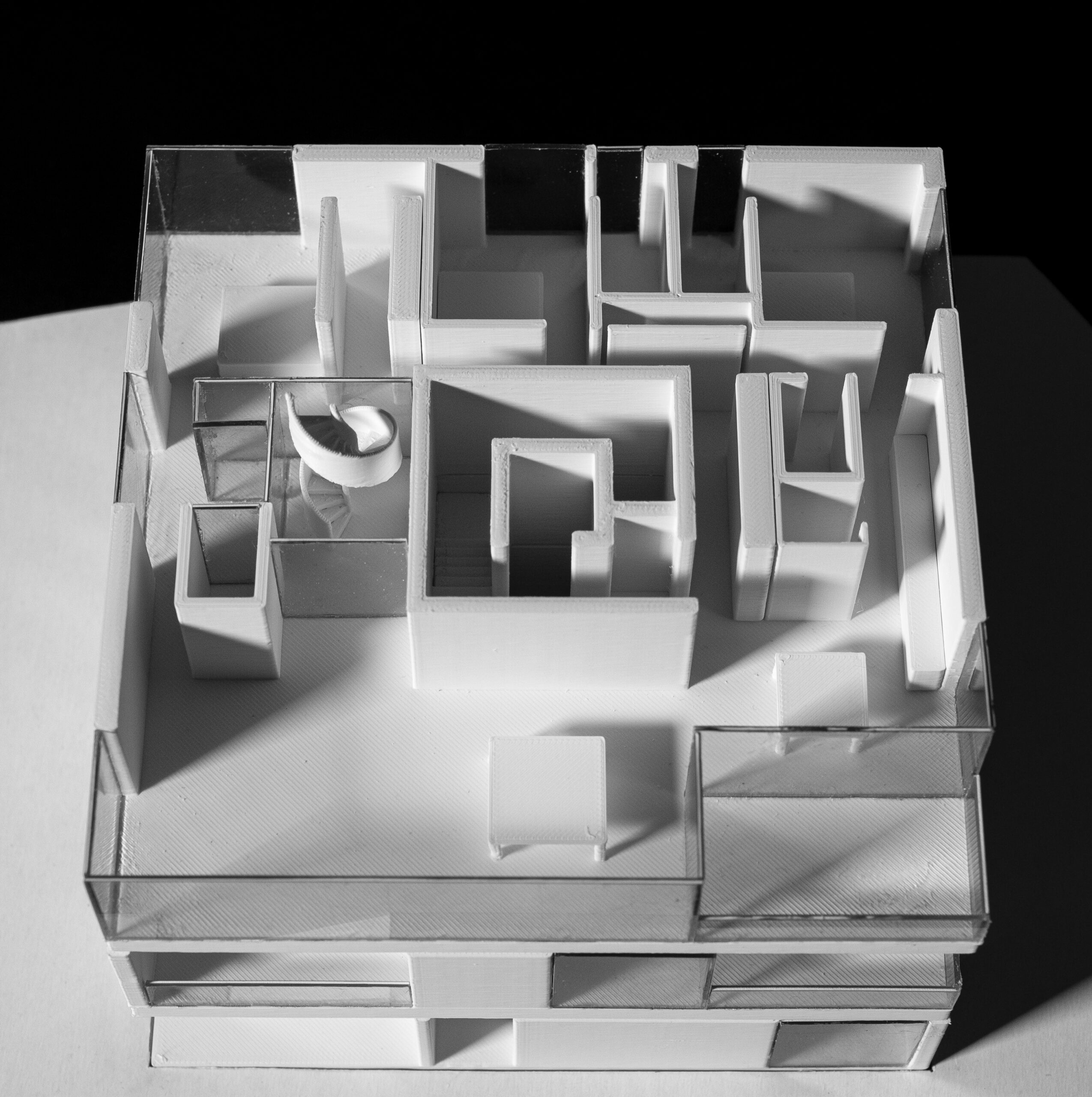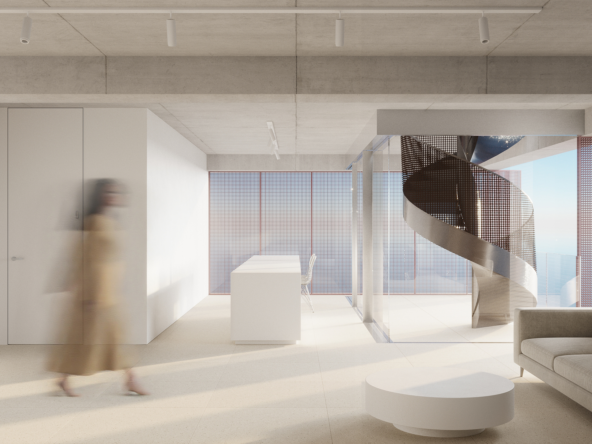 Given the square shape of the buildings, we devised a central atrium that brings natural light and fresh air to the rooms on the inside on all four levels. In addition, all landings of the atrium provide direct views of the sea, furthering the connection with the surroundings. This space also provides the access to all flats through a central helicoidal staircase, which works as a palatial reference to the high-end quality of the development.