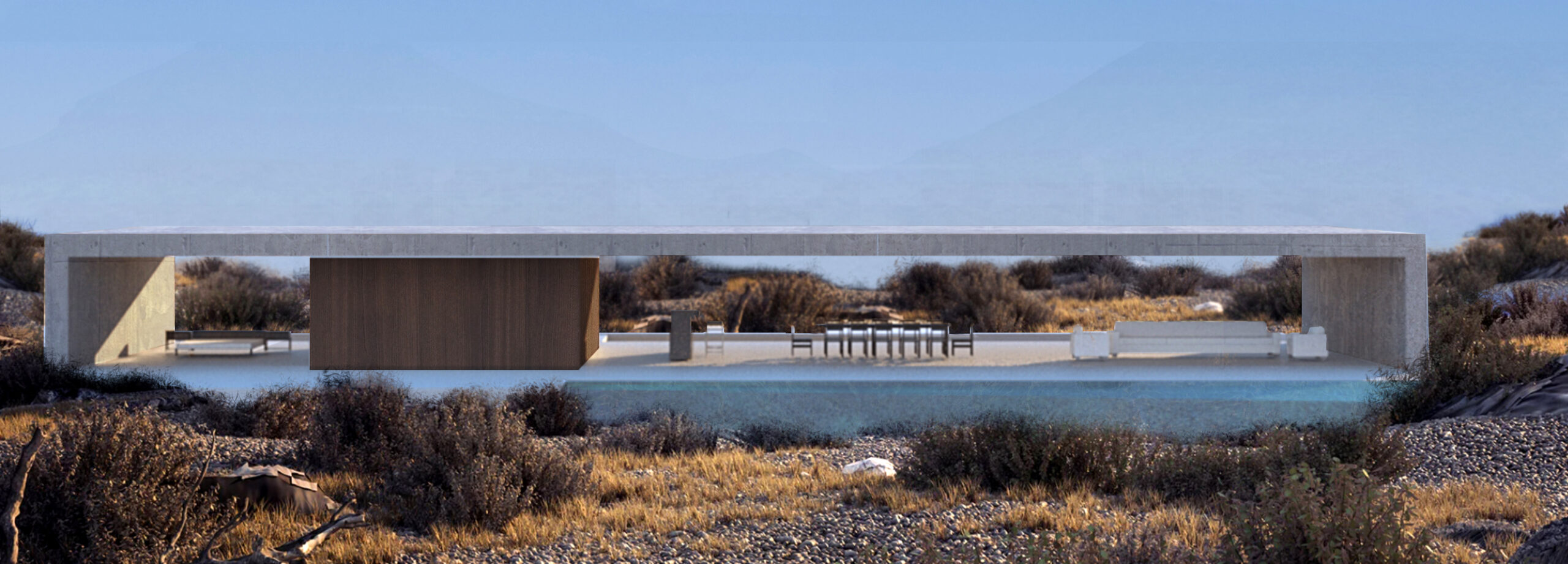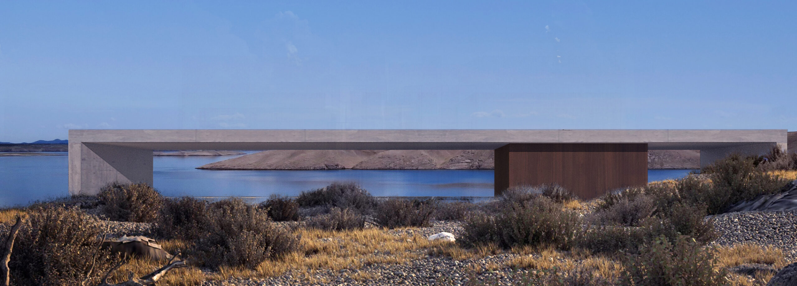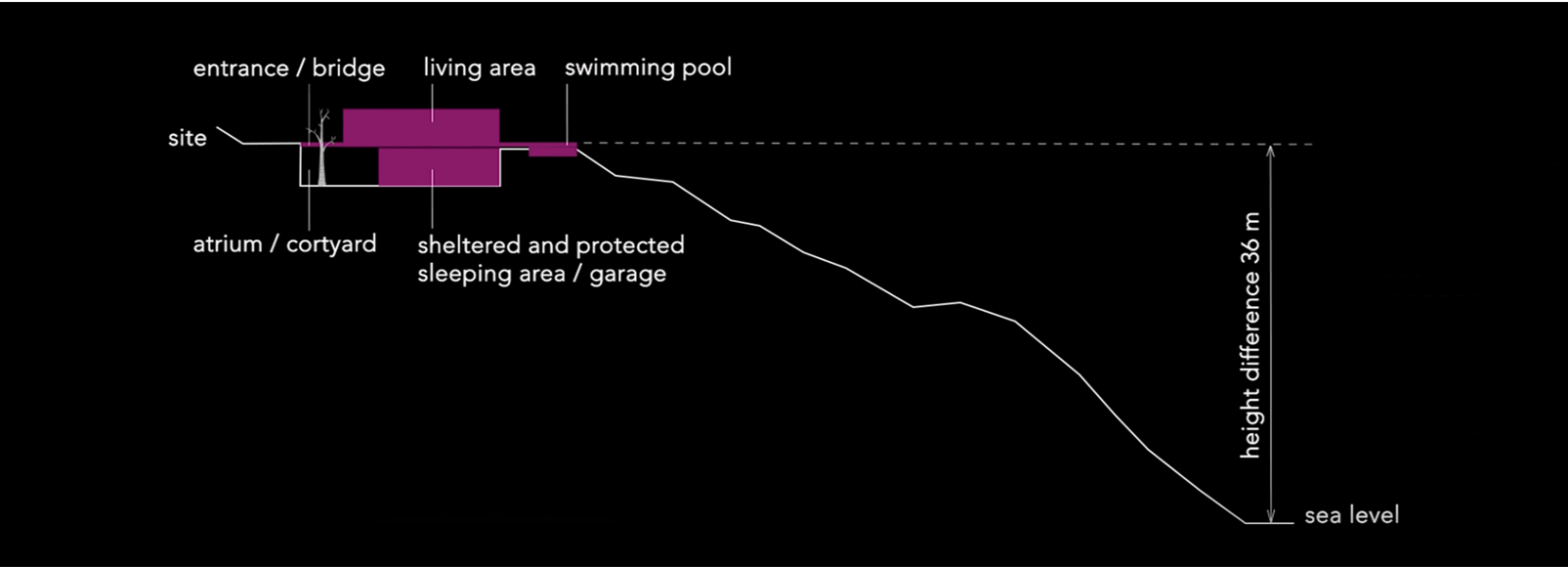 Our vision echoes the sparsity of the terrain via two thin stacked boxes that embed themselves into a slope ending in the sea, 36m below.