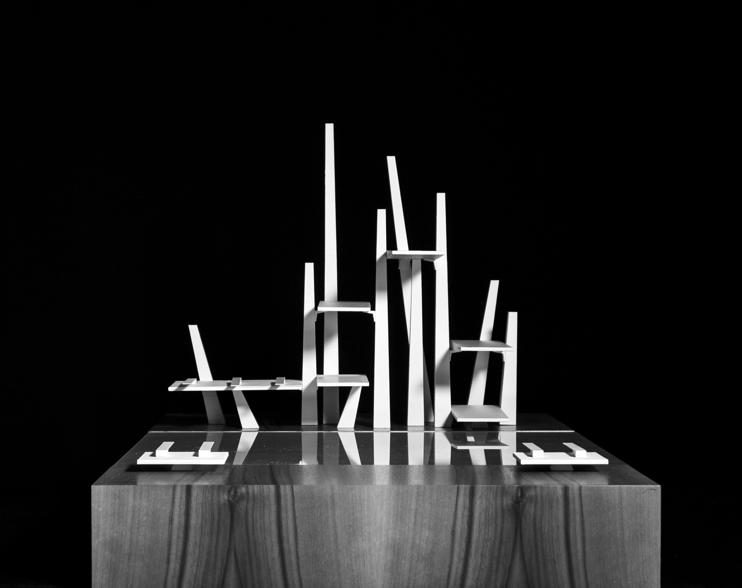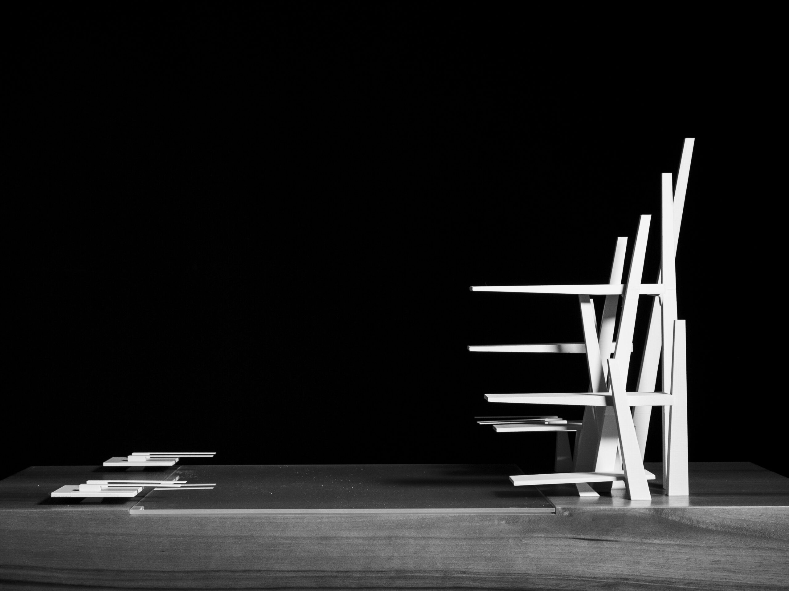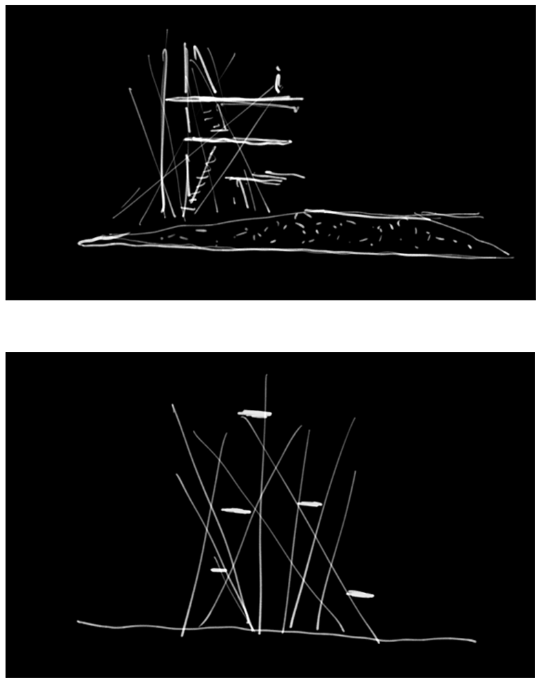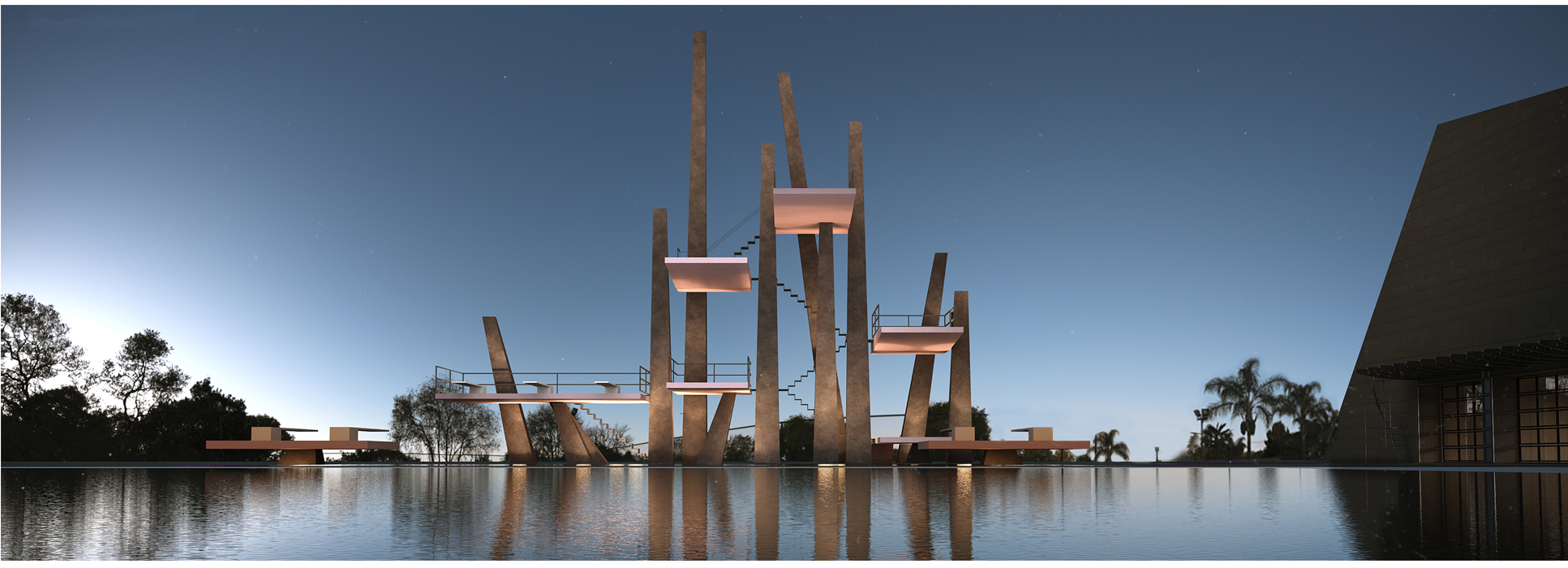 Our design is a poetic gesture, where at first glance simple construction columns are “repurposed” as it were, for the sport of diving. The proposed structure is a Mikado-like set of columns and planks, arranged seemingly by chance, that create a unique and distinctive profile.